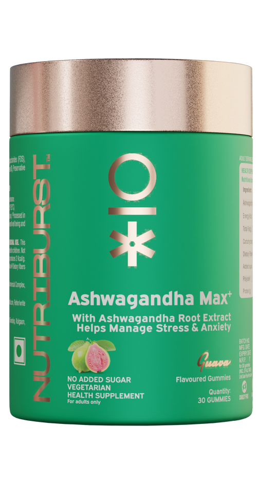 Find calm amidst the chaos with Nutriburst Ashwagandha Max Gummies guava-flavoured bites infused with potent Ashwagandha Root extract to help relieve stress and anxiety. Thoughtfully crafted for mental and physical well-being, they’re your daily dose of serenity. Each budget pack offers a 15 days & 30 days supply with two gummies a day