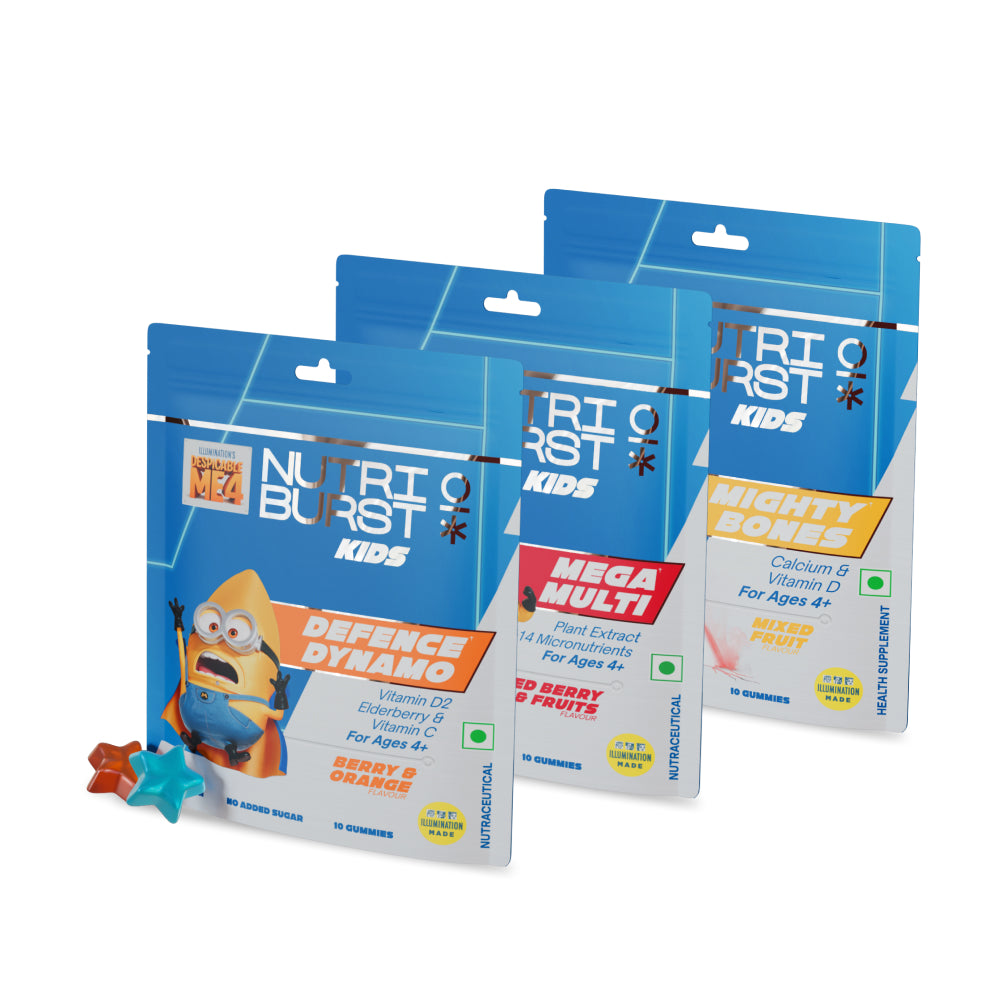 "Take your child on an exciting, health-boosting adventure with NutriBurst Defence Dynamo Minions Kids Gummies! These gummies are designed to make daily nutrition fun and easy, with the lovable Minions characters that your child adores. Packed with essential nutrients like vitamin D, vitamin C, and black elderberry extract, these chewable gummies help support a strong immune system and keep your child energized throughout the day.